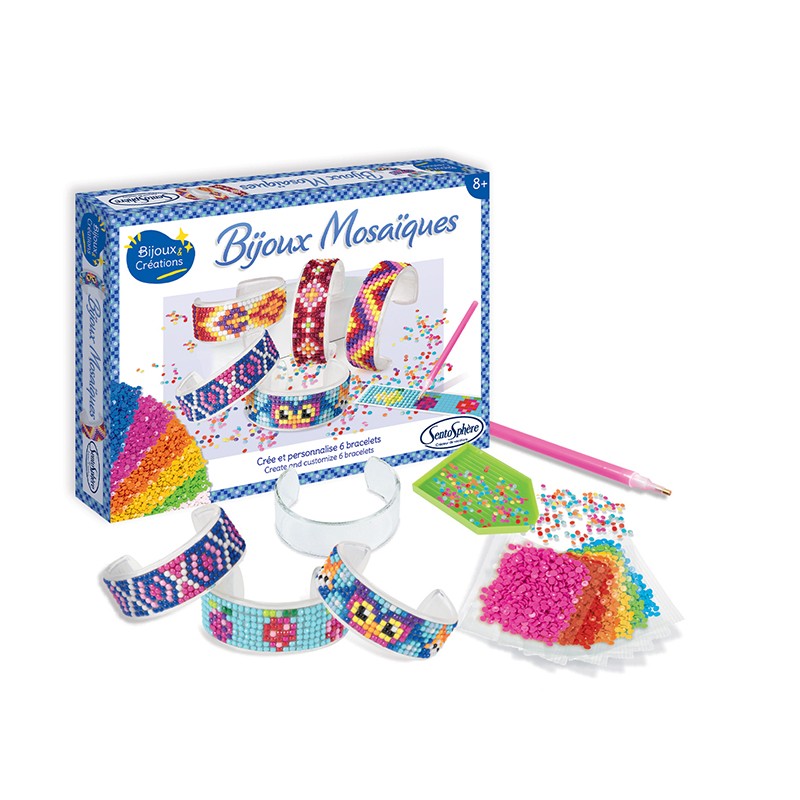 Αυτό το πλήρες δημιουργικό σετ σας επιτρέπει να φτιάξετε 6 υπέροχα βραχιόλια από ακρυλικό, τα οποία μπορείτε να διακοσμήσετε με ένα μωσαϊκό από αδιαφανείς μικροψηφίδες (mini mosaiques).