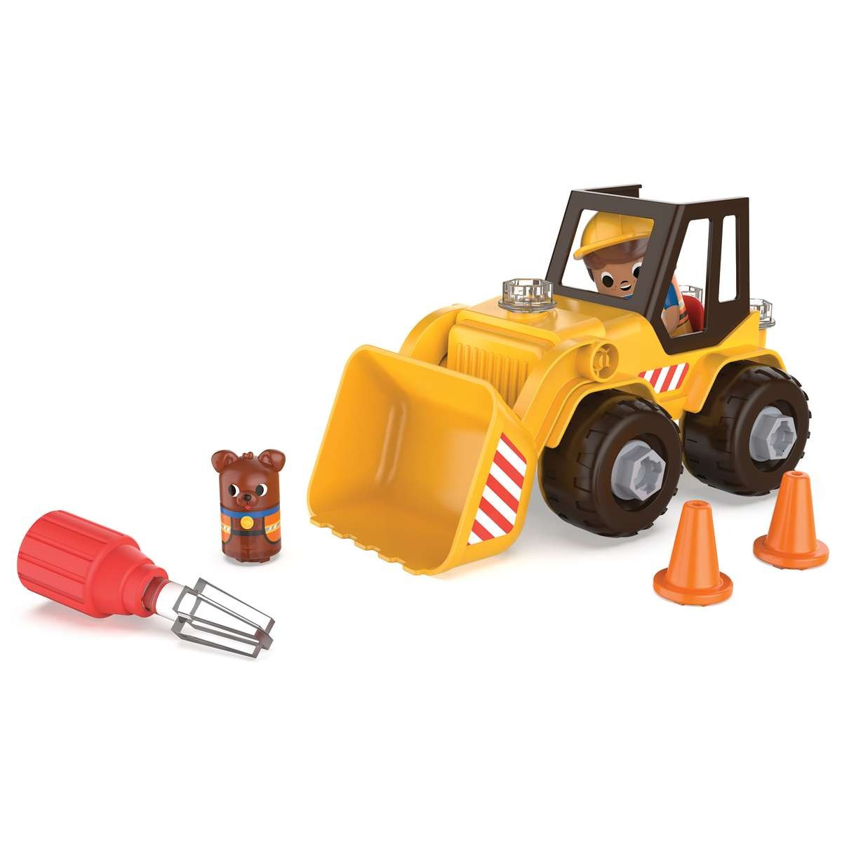 Τα παιδιά χρησιμοποιούν ένα χειροκίνητο κατσαβίδι και πολύχρωμες βίδες για να φτιάξουν τη δική τους μπουλντόζα, με κινητό κάδο εκσκαφής που ανεβοκατεβαίνει.